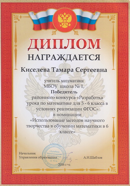 | 2016 год | Диплом победителя районного конкурса "Разработка урока по математике для 5-6 класса в условиях реализации ФГОС" в номинации "Использование методов научного творчества в обучении математики в 6 классе" | ![]() |